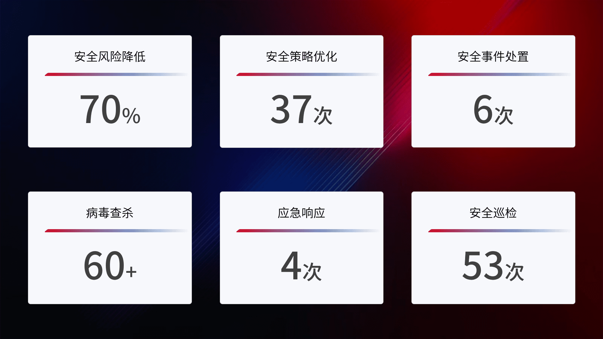 提供全面的安全事件报告体系,,,包括处置报告、、周报、、、季度和年度总结,,结合持续监控,,,,帮助客户深入了解网络安全状况。。。