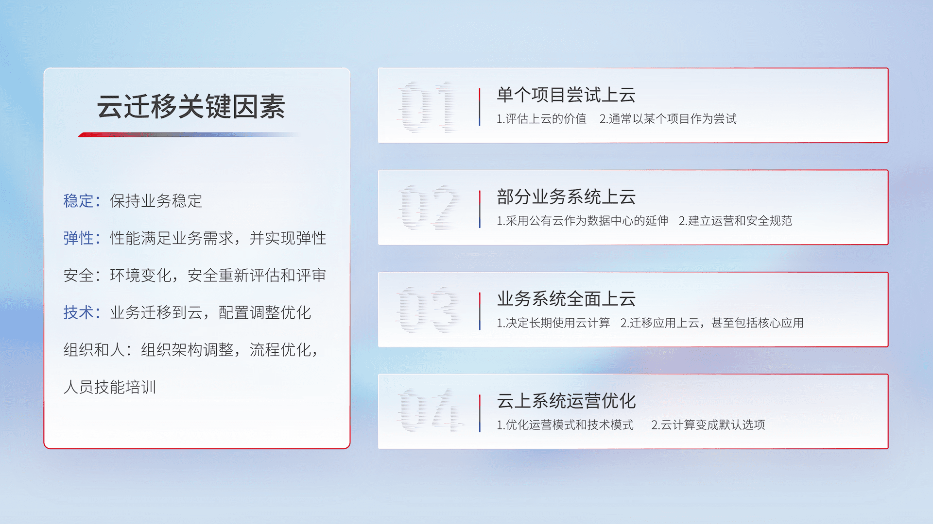 结合实际业务,,从规划设计、、云平台选型、、、、云原生改造、、数据迁移、、、集成交付,,,,迁移全过程为客户识别最佳上云路径,,做好风险识别管理,,,设计网络架构、、、身份权限、、安全审计合规、、、、操作审计、、日志审计、、、监控告警策略、、、、多站点容灾设计等,,,,对云上基础设施进行整体规划,,,提升IT治理水平,,以满足弹性、、、高可用、、高性能的需求。。