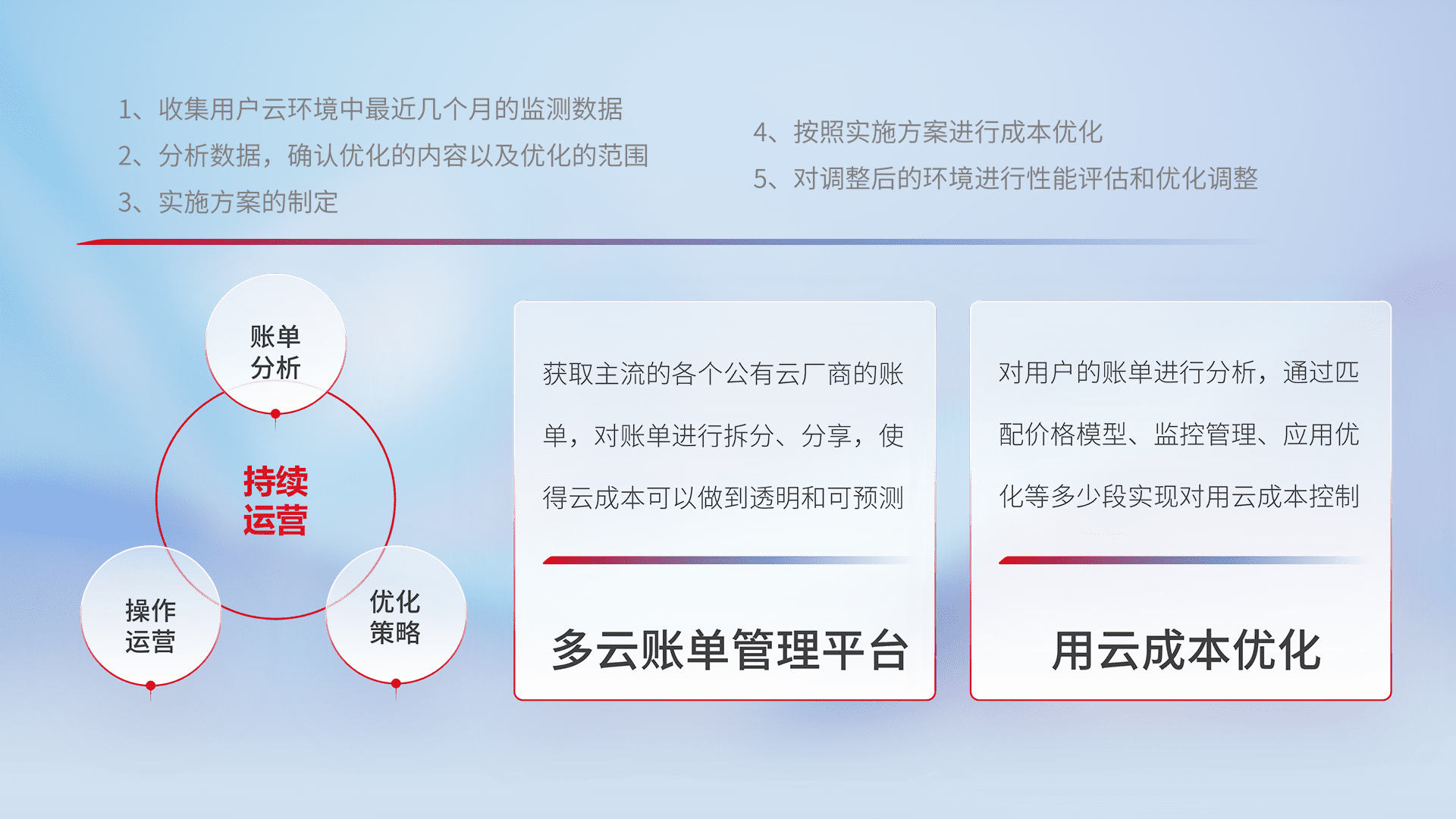 通过多云纳管,,,以统一的资源数据模型把客户的云资源进行抽象和封装,,进而实现对多云资源的统一操作,,保障云资源管理的可靠性、、稳定性与可用性。。。量身定制化运维内容,,配置、、、开发运维、、补丁管理、、、备份、、监控、、认证和访问管理、、审计和日常巡检等,,,,保障在用云过程中的可靠度,,,稳定度以及高可用率。。。。